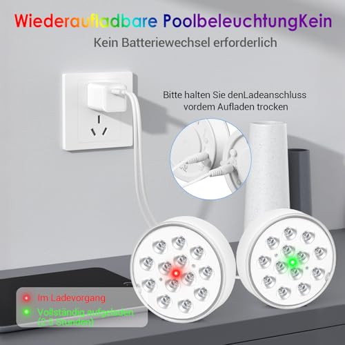 ⭐【1】Helleres, Wiederaufladbares Unterwasserlicht: Wiederaufladbare Pool-Leuchte mit 1200 mAh, dauert 6 Stunden, um vollständig aufzuladen. universelles USB-A zu USB-C Kabel für schnelles Aufladen. Das Poollicht ist mit 13 hellen Lichtperlen für ein helles und komfortables Lichterlebnis ausgestattet. Keine Notwendigkeit, wiederholt Batterien zu ersetzen, sparen Sie Geld.Bitte verwenden Sie ein Handtuch, um das Wasser auf dem Ladeanschluss vor dem Laden zu trocknen, bitte setzen Sie den Empfänger nicht unter Wasser.