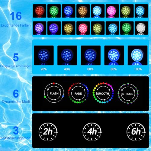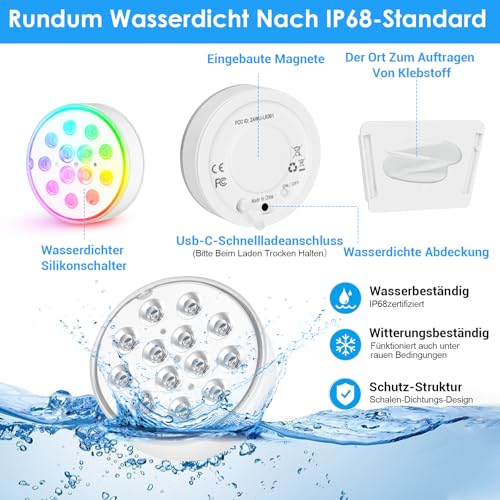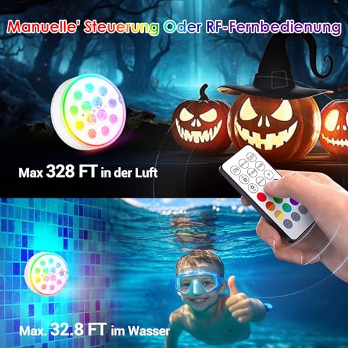 ⭐【3】IP68 Vollständig Wasserdichte Led-Leuchten Ultra-Lange Distanz Kontrolle: IP68 wasserdicht, hergestellt aus ultra-haltbarem ABS + hochwertigem lichtübertragendem Material, einteilige Struktur wasserdichtes Schwimmbadlicht, vollständig wasserdicht, keine Notwendigkeit, die Batterie zu ersetzen. Die maximale Reichweite beträgt 200 Fuß (in der Luft), 10-17 Fuß (unter Wasser), und kann sogar durch Wasser und Wände gehen.