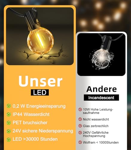 Erweiterbar und Einfach Austauschbar : Diese lichterkette mit glühbirnen enthält 25 E12-Fassungen und 27 G40-Glühbirnen (inklusive 2 Ersatzlampen). Dank des cleveren Designs können mehrere lichterketten außen miteinander verbunden werden, um größere Flächen zu beleuchten und Ihre Gartenbeleuchtung zu erweitern.