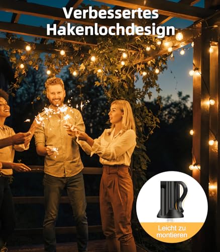 Einfache Installation und vielseitige Nutzung : Mit den integrierten Haken an jeder Fassung lässt sich die garten lichterkette mühelos an Zäunen, Bäumen oder anderen Strukturen befestigen. Ihre flexible und strapazierfähige Bauweise macht die beleuchtung garten besonders anwenderfreundlich und sicher für den Außeneinsatz.