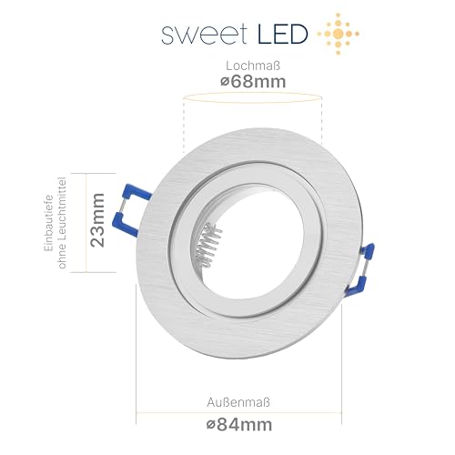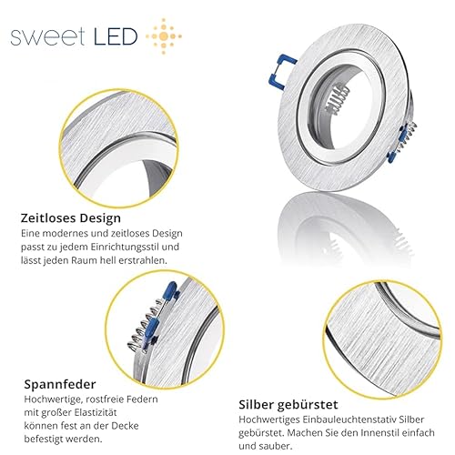 Sweet Led 4x Einbaustrahler GU10 – Aluminium IP44 Spritzwassergeschützt – Ø68mm – Einbaurahmen für Bad & Küche – Deckenspot rund – Ohne Leuchtmittel – Silber gebürstet – 230V
