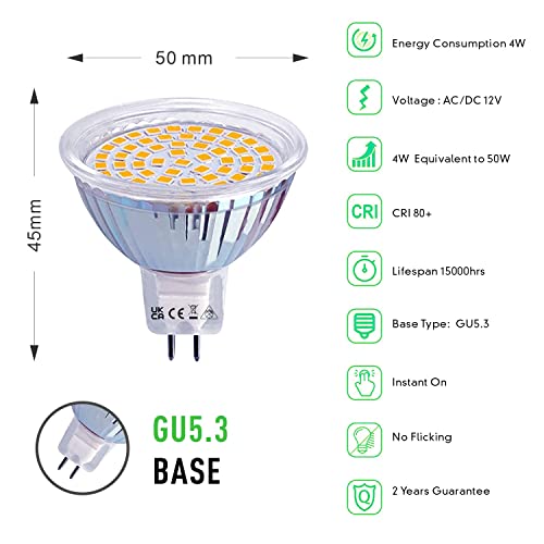 Bright GU5.3 LED Bulbs Cool White 400 Lumens 3000K Warm White With a beam angle of 120 degrees, these lamps can cast an even floodlight for general lighting, which is more diffuse and uniform than narrow-angle spot light and illuminates the whole room no shadows. Non-dimmable.