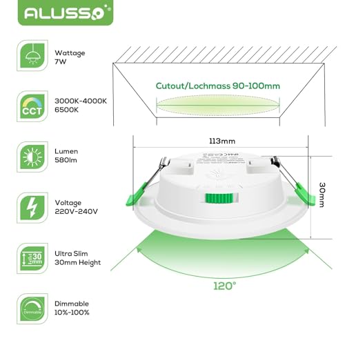 【Hochwertige LED Deckenleuchte】 ALUSSO 7W LED Einbaustrahler mit SMD LED der neuesten Technologie haben eine hoch Energieeffizienz und einen geringeren Verbrauch, sparen bis zu 90% im Vergleich zu Halogenlampen, das integrierte Design macht ein externes Netzteil überflüssig und hat eine gute Wärmeableitung. Keine UV-Strahlen, keine augenreizung, besserer augenschutz.