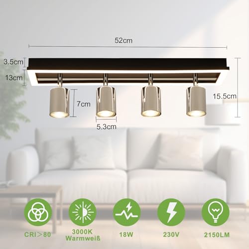 meoaow LED Deckenstrahler 4 Flammig Deckenleuchte: GU10 Deckenspots Schwenkbar Küchenlampe Silber Strahler 18W Warmweiß Deckenlampe 52CM für Büro Wohnzimmer Schlafzimmer Esszimmer (Ohne Leuchtmittel)