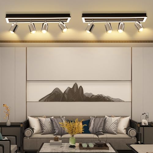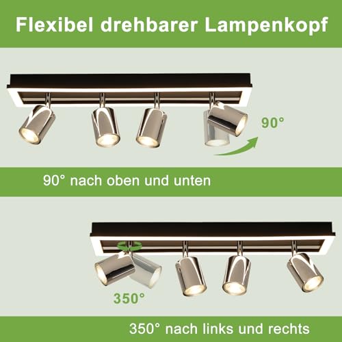 KREATIVE DESIGN MIT GRUNDLICHT:Die LED-Deckenleuchte besteht aus einem schwarzen langen Baldachin mit warmweißen LEDs und vier silbernen GU10-Leuchtenköpfen in Zylinder-Form. Diese moderne Deckenstrahler ist aus robustem schwarzen Metall und silbernem Aluminium gefertigt. Das schlichte, moderne Design verleiht Ihrem Raum eine zeitgenössische und dekorative Note