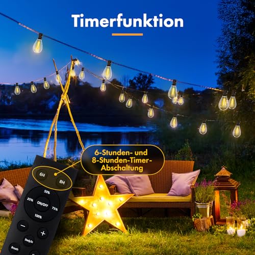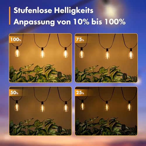LED-Lampe IP44 Wasserdicht: Diese garten beleuchtungen haben die Schutzart IP44 für den Außenbereich (der Stecker ist nicht wasserdicht), wodurch sie resistent gegen Regen, Spritzwasser und Staub sind. Ob Sie Ihren Garten, Ihre Terrasse oder Ihren Hinterhof für eine Party oder einen ruhigen Abend beleuchten, diese wasserdichten party lichterkette draußen sind perfekt für jedes Außenumfeld und gewährleisten eine zuverlässige Leistung bei allen Wetterbedingungen.