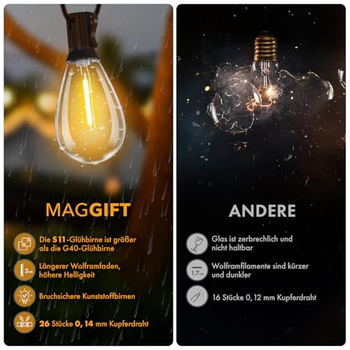 Mehr Exzellente S11-Lampen: Das MAGGIFT 30 Meter (einschließlich 3 Meter Stromkabel) balkon lichterkette ist mit 50 S11 LED-Lampen und 2 Ersatzlampen ausgestattet. Die Lichter sind langlebig und können sicher mit bis zu 100 Lampen verbunden werden, was Flexibilität für große Räume bietet. Die S11-Lampe ist größer und heller als die G40-Lampe und eignet sich daher hervorragend zur Beleuchtung größerer Flächen.